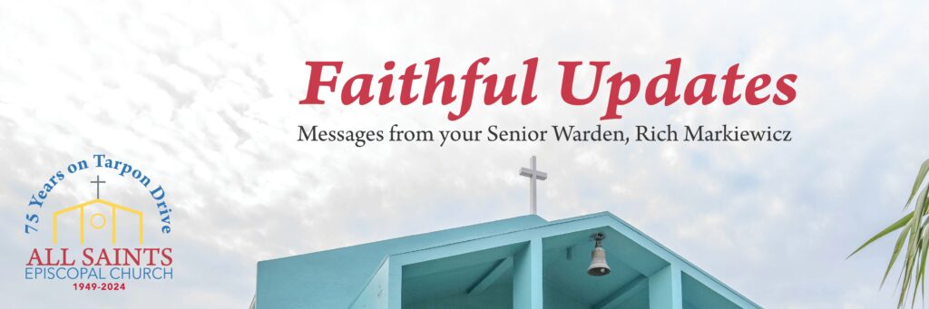 As we all continue to build God’s kingdom together, it is my pleasure to continue to serve as your Senior Warden. I could not do this without the help and love of each one of you. I am so thankful for you and your gifts, and I appreciate all that you do for All Saints Church. You are what makes All Saints a very special place.